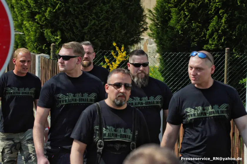 Thomas Kalcher-Cibulka mit Kameraden im „Alpen-Donau.Info“ T-Shirt beim Neonazi-Kampfsportevent „Kampf der Nibelungen“ am 13. Oktober 2018 im deutschen Ostritz.